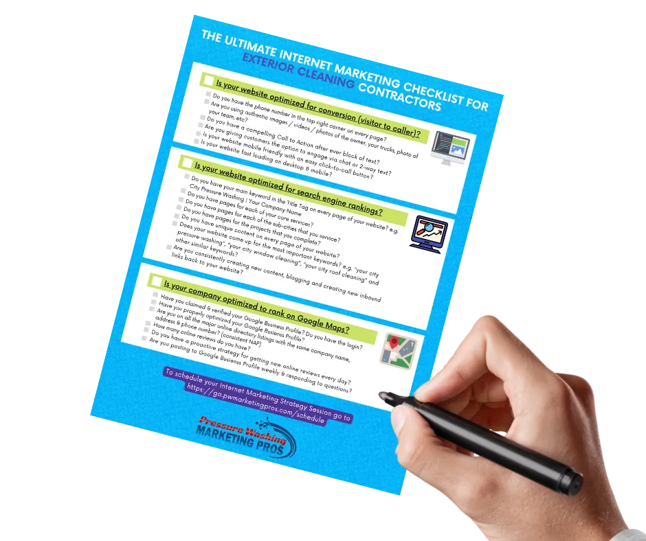How to get your Internet Marketing Right for your Exterior Cleaning Business. This checklist will help you identify what is missing from your current strategy and what you must focus on next to take your company to the next level.
